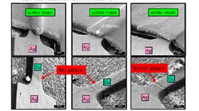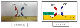 在正常條件下,由于銀與銅能發(fā)生置換反應(yīng),由于不同金屬元素化學(xué)置換電動(dòng)勢(shì)差異,低電勢(shì)元素會(huì)被高電勢(shì)元素所氧化(丟電子),而高電動(dòng)勢(shì)元素得到電子而還原,在沉銀缸中,Ag離子在此反應(yīng)得到電子還原(2Ag+ + 2e →2Ag,半反應(yīng)電動(dòng)勢(shì)E0=0.799volts),銅被氧化丟電子(Cu-→Cu2++2e-,半反應(yīng)電動(dòng)勢(shì)=0.340volts),這樣,銅的氧化和銀離子的還原同時(shí)進(jìn)行,形成均勻的鍍銀層,如上反應(yīng)式及圖1所示。然而,如果阻焊層和銅線路之間出現(xiàn)“縫隙”,縫隙里銀離子的供應(yīng)就會(huì)受限,阻焊層下面的銅可以被腐蝕為銅離子,為裂縫外的銅焊盤上的銀離子還原反應(yīng)提供電子(如圖 2 所示)。由于所需的電子數(shù)量與還原的銀離子數(shù)量成比例,賈凡尼效應(yīng)的強(qiáng)度隨暴露銅焊盤表面積及鍍銀層厚度而增加。