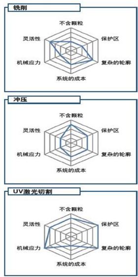 SMT后分板即切割多種電子元器件已被裝配的電路板,該工序已經(jīng)處在生產(chǎn)鏈的末端。對于分板,可選擇不同的技術(shù):對于通常用的PCB,優(yōu)先考慮使用傳統(tǒng)的刀切、沖壓和輪廓銑削等工藝。對于較為復(fù)雜的電子線路以及薄型基板尤其是對機(jī)械應(yīng)力、粉塵和尺寸偏差非常敏感的情況,則采用UV激光切割分板更有優(yōu)勢。以下三個(gè)圖表從不同因素對這三種方法進(jìn)行了評估。