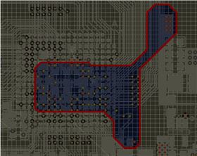 隨后在DP3V3的大電源層中劃分出小的區(qū)域,分別作為DP1V2與DP1V2PLL的電源層。首先高亮出DP1V2的過孔網(wǎng)絡,使用劃線快捷鍵P+L對其進行區(qū)域劃分。區(qū)域劃分后雙擊畫出來的封閉區(qū)域,為其設(shè)置網(wǎng)絡為DP1V2。如果希望直觀觀察的話,可以為網(wǎng)絡設(shè)置單獨的顏色,方便觀察。
