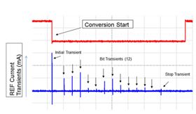 圖1顯示典型12位SAR ADC基準(zhǔn)終端上的轉(zhuǎn)換階段期間的電流瞬變。