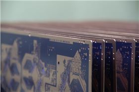 白色部分是被錫覆蓋的線路部分,而干膜覆蓋的部分因被其隔離而無法附上錫離子。而實(shí)際上電鍍除了加厚銅的作用之外,其鍍錫是為了在后續(xù)外層蝕刻的步驟保護(hù)線路層不被蝕掉。藍(lán)色干膜覆蓋的部分則是需要被蝕刻的部分。