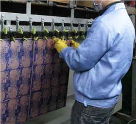 接下來就是見證奇跡的時候,別人被電擊到頭發(fā)都會豎起來,不知道我被電是神馬感覺。線路板廠的帥哥們把我們固定在了電鍍線的夾套上,等待電流的洗禮。