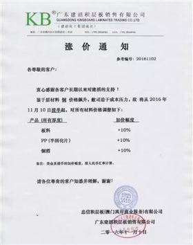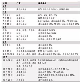 據(jù)了解,從3月份建滔領(lǐng)先漲價以后,7月份聯(lián)茂、建滔再次對覆銅板漲價,到了8月份,南亞、聯(lián)茂、太廣電等覆銅板大廠正式漲價5%~10%,其中南亞還會根據(jù)市場情況進(jìn)行平均每兩個月進(jìn)行一次調(diào)價,9月份,生益科技、建滔和聯(lián)茂繼續(xù)發(fā)布通知漲價,10月份以后,線是中小覆銅板廠商在9月份漲價的基礎(chǔ)上進(jìn)行調(diào)高相關(guān)覆銅板價格3~4元/張,隨后建滔再次表示,對所有的厚度板料增加人民幣10元,在此之后,金安國紀(jì)、山東金寶也跟著發(fā)布漲價通知,漲幅在5%~10%之間。