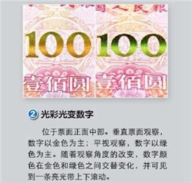 二看光彩光變數(shù)字。在鈔票正面中部印有光彩光變數(shù)字“100”,垂直觀察票面,數(shù)字“100”以金色為主;平視觀察,數(shù)字“100”以綠色為主。隨著觀察角度的改變,數(shù)字“100”顏色在金色和綠色之間交替變化,并可見到一條亮光帶在數(shù)字上下滾動(dòng)。