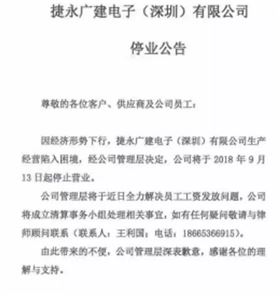 9月13日,捷永廣建電子(深圳)有限公司發(fā)布的停業(yè)公告