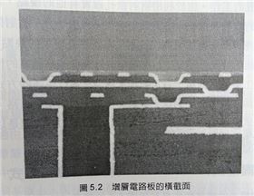 圖5.1的制程步驟為2+0線路板的情形,如果層數(shù)增加時,基本上只是重復(fù)上述步驟。如果兩面都有增層層時,必須分別在基層兩面進(jìn)行絕緣層涂布,但是可以同時進(jìn)行兩面的電鍍制程。圖5.2是完成之后的3層增層層橫截面照片。