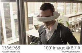 當然,大屏看視頻是其最大亮點,只需要將耳機和手機通過HDMI線連接(配送),將頭帶向前滑動90度,它就可以變身成為頭戴式家庭影院。同時,具有雙高清虛擬投影功能,內置全彩RGB LED寬屏虛擬投影顯示,能提供1366×768畫質、8.7英尺的畫面體驗,(注意,不是英寸?。队皥D像大小相當于從8.7英尺距離觀看100英寸的屏幕。